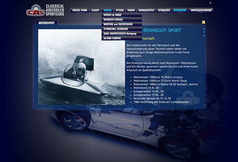 Restauration, Revisionen von Motoren und Getrieben, Leistungssteigerung für viele Porsche-Modelle, Porsche-Tuning (z. B. LM 220 Motorleistungskit / Chiptuning), Sportauspuffanlagen, Endrohre, Tachoscheiben, Cuprohr, Kat-Nachrüstung für Porsche, VW, sowie Inspektionen, Wartung, Services.