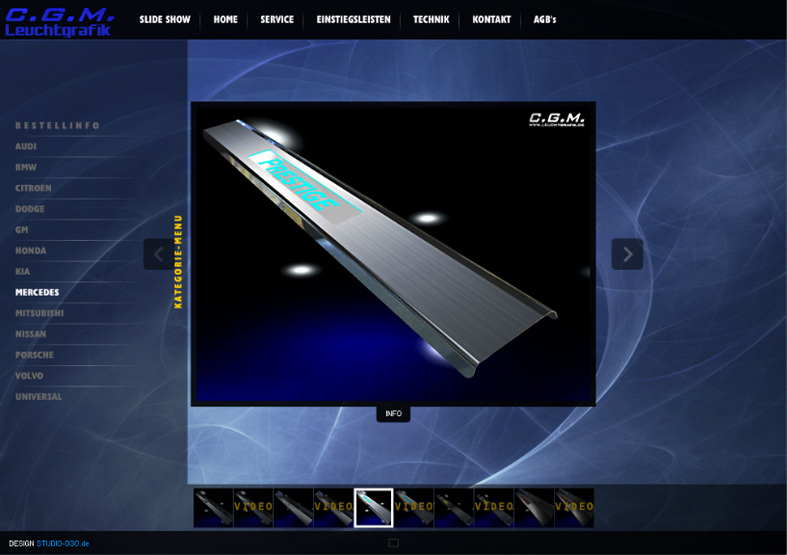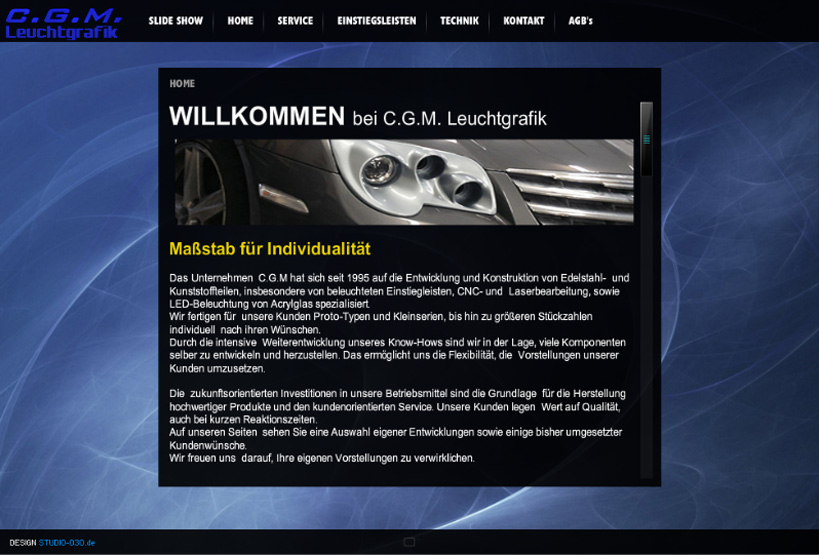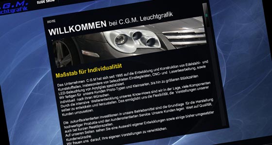 Das Unternehmen C.G.M hat sich seit 1995 auf die Entwicklung und Konstruktion von Edelstahl- und Kunststoffteilen, insbesondere von beleuchteten Einstiegleisten, CNC- und Laserbearbeitung, sowie LED-Beleuchtung von Acrylglas spezialisiert.