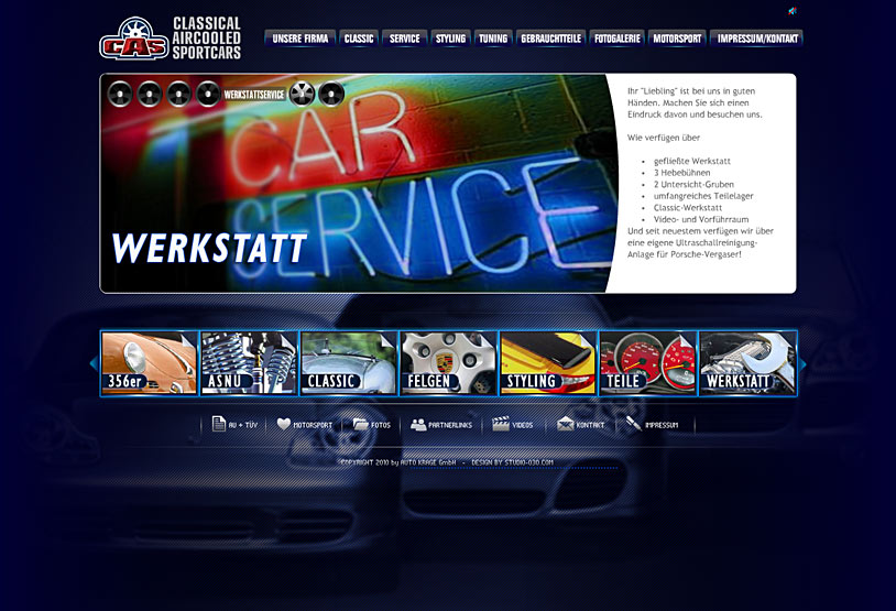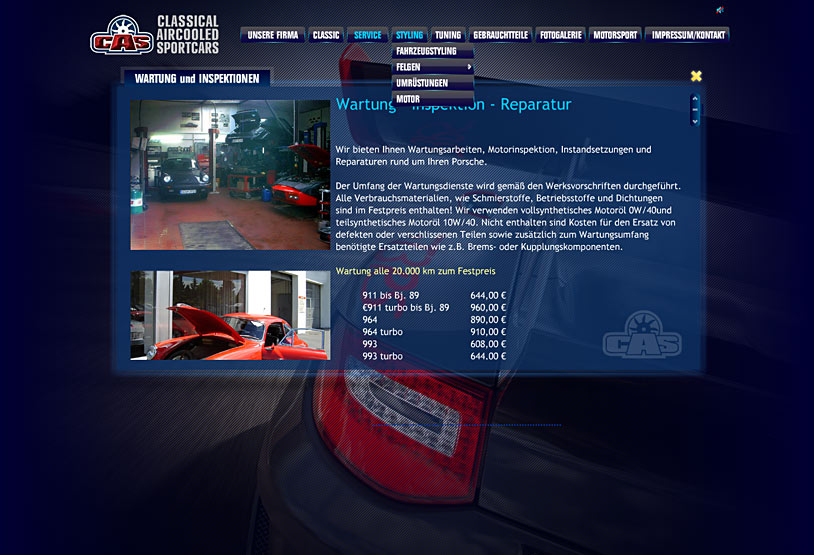 Restauration, Revisionen von Motoren und Getrieben, Leistungssteigerung für viele Porsche-Modelle, Porsche-Tuning (z. B. LM 220 Motorleistungskit / Chiptuning), Sportauspuffanlagen, Endrohre, Tachoscheiben, Cuprohr, Kat-Nachrüstung für Porsche, VW, sowie Inspektionen, Wartung, Services.
