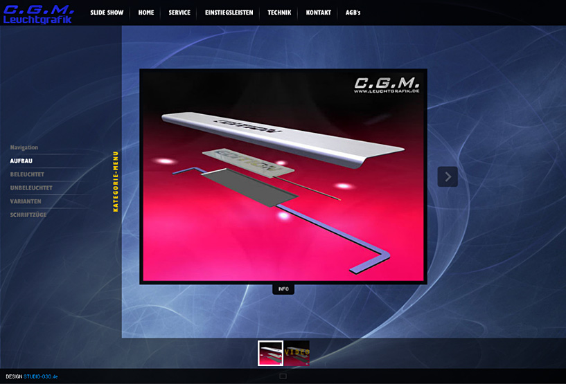 Das Unternehmen C.G.M hat sich seit 1995 auf die Entwicklung und Konstruktion von Edelstahl- und Kunststoffteilen, insbesondere von beleuchteten Einstiegleisten, CNC- und Laserbearbeitung, sowie LED-Beleuchtung von Acrylglas spezialisiert.